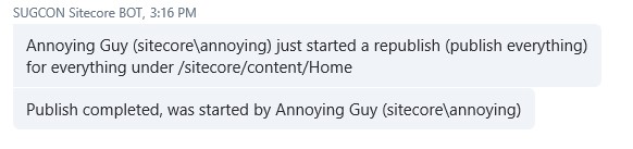 I’ve implemented several intents for publishing activities. If you would like to perform a publish and get notified on publish events of others you can use the Bot. The notifications work the same as the notifications for the indexing events.