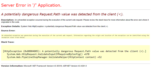 Something that is hardly ever found on Google indexes is the default .NET error page. If you happen to spend some time cuddling with customErrors and statusCodes in your web.config file, make sure you have a good static html fallback scenario for situations like URL’s with just a < in the URL. Test this scenario and prepare for these requests to never hit Sitecore because it has been hijacked by System Web RequestFiltering. https://docs.microsoft.com/en-us/iis/configuration/system.webserver/security/requestfiltering/