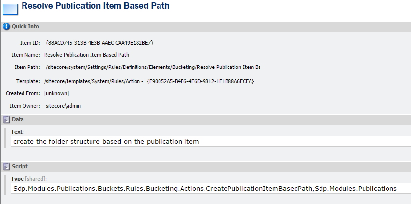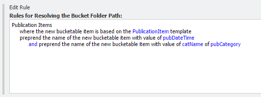 We need to create an action that does the following. First we stop our action if we’re not dealing with an item that is not based on our Publication Item template. Next we need to get our item from the database because our actual item isn’t passed into our action. If we’re dealing with an item that has to be created then we’re not getting our item from the database because it isn’t created yet. If we’re working with an item that has already been created, for example the item is moved into the bucket, then we can get the item from the database. If the item is new we use DateTime.Now as our value, if the item already existed then we take the value of the DateField “pubDate”. If that field has no value then we take DateTime.Now. Next we need to determine the category where would like to see in our Bucket Folder Path. For this value we get the item our category field is pointing at and when have that Category Item we take the Category Name field from that item. If no category had been set we take a default value “Uncategorized”. After this we assemble our path by adding the values to a simple list of strings and set the outcome of the string.Join method on our parts to the ResolvedPath property of the ruleContext.