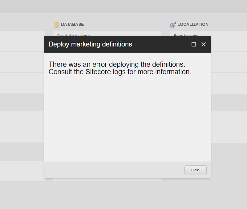 When you are trying to resolve this issue you will probably decide to deploy the marketing definitions from the master database to the marketing definition repositories. This could be done by using the “Deploy marketing definitions” option in the Control Panel of Sitecore. This deployment should lead into a successful deployment. If the deployment happens to fail then you will be prompted with the following message and exception in your Sitecore log.